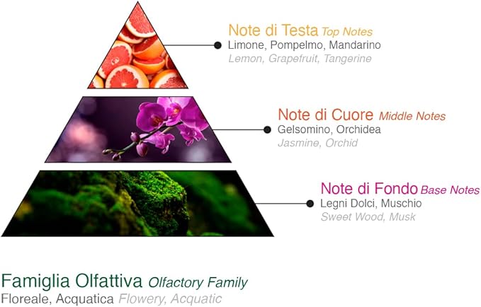 - ERGAMOTTO DI CALABRIA: Mandarino, Ribes Nero - Note di Cuore: Rosa Bulgara, Fiori d'Arancio, Ylang-Ylang - Note di Fondo: Vaniglia del Madagascar, Legno di Sandalo,Muschio Bianco,